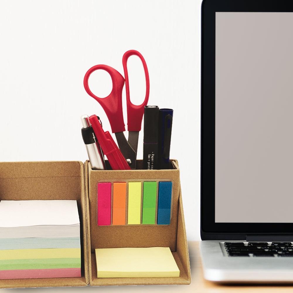 A handy and compact tool to organize workspaces, the Instadesk unfolds to reveal a pen/pencil cup, note cube, adhesive notes, and sticky flags. Made with durable cardboard and available with a one-color imprint.
