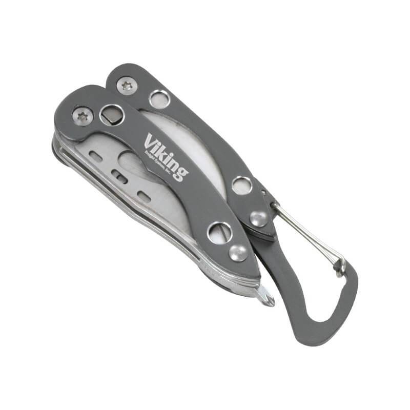 A compact multi-tool that delivers a ton of features and value. This compact tool features a spring-action pliers, wire cutter, two blades, two screwdrivers, and a bottle opener, along with an attached carabiner clip. Available in 3 colors with a laser engraved logo.