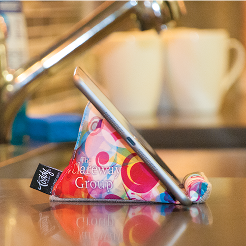 This multi-function desk accessory will stand out. 3-sided imprint means your message will be seen whether or not it is in use. Hand-made multi-function media stand with sublimated microfiber cloth, durable plush microfiber bottom, and recycled acrylic fill. Works as a phone holder/media lounger, screen cleaner, glass cleaner, and stress reliever. Machine washable, anti-microbial. Decorated via full color dye sublimation, with full color and full coverage.