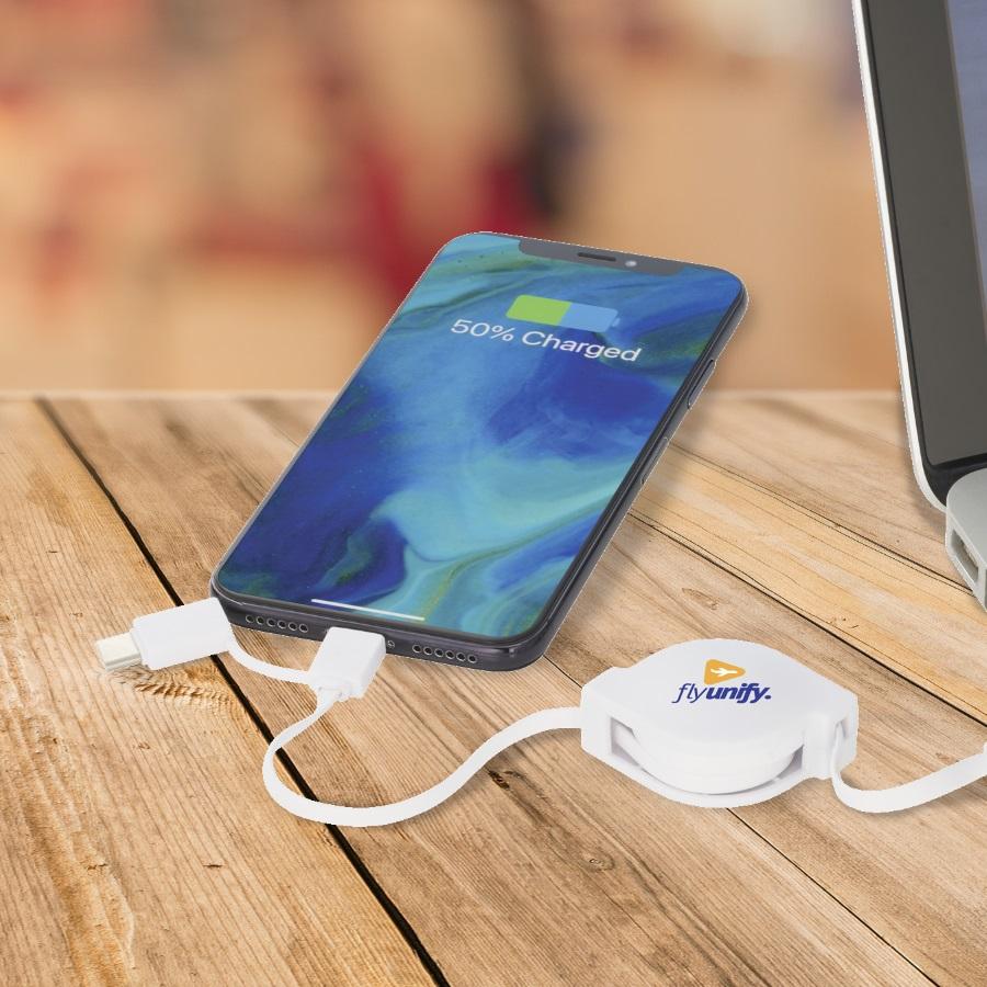 Looking for an affordable charging accessory for events? The Triple 3-in-1 Charging Cable will support most modern devices, with a built-in USB C charger, and a handy 2-in-1 adapter that supports Micro USB and most iOS devices (iPad Pro not supported). When not in use, the Triple 3-in-1 Charging Cable retracts into itself, making it compact and convenient to throw in a bag or your pocket, without having to worry about tangled cables!
