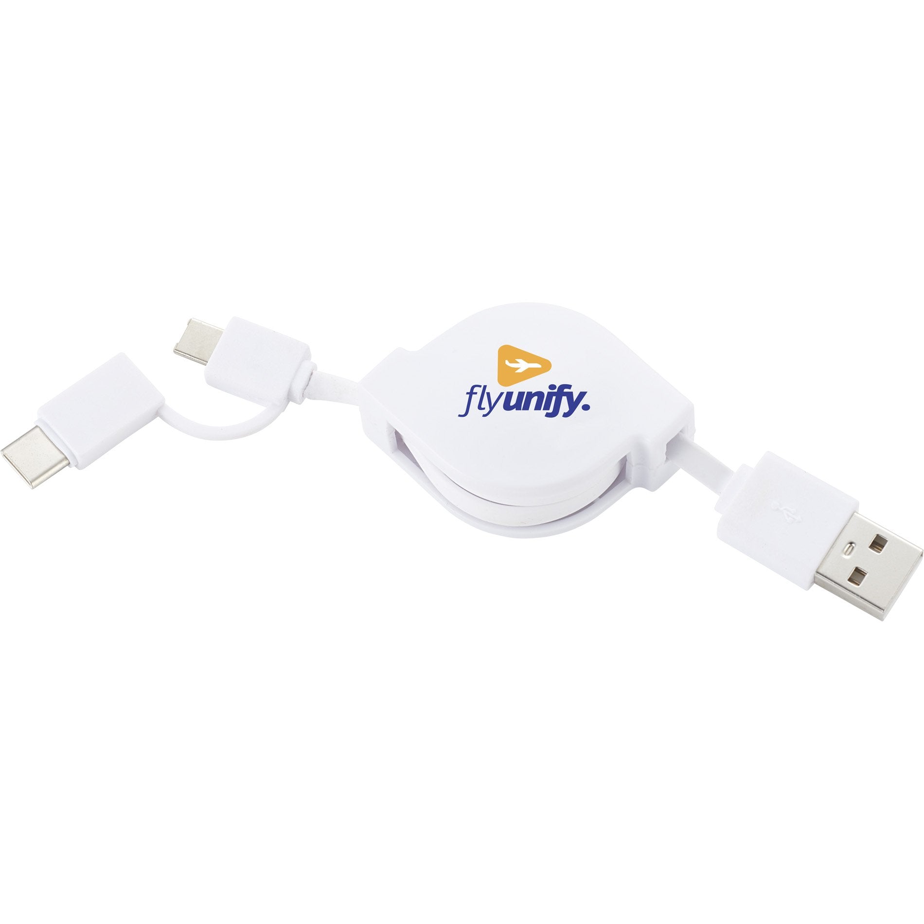 Convenient and compact, the Triple 3-in-1 Charging Cable supports USB Type C, Micro USB, and iOS devices, with a retractor to keep your cables from getting tangled when not in use. Your price includes a 1-color imprint.